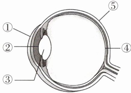 C 【解析】①角膜是无色透明的,可以透光。②瞳孔的大小能改变,强光下瞳孔缩小,减少进入眼内的光量,以保护视网膜不受强光的刺激;弱光下瞳孔扩大,增加进入眼内的光量,使视网膜能感受到足够的光刺激。③晶状体透明,有弹性,像双凸透镜,能折射光,如果晶状体的曲度过大且不易恢复原状,物像会落到视网膜的前方,从而引起近视。⑤是巩膜,白色,坚韧,可保护眼球的内部结构。