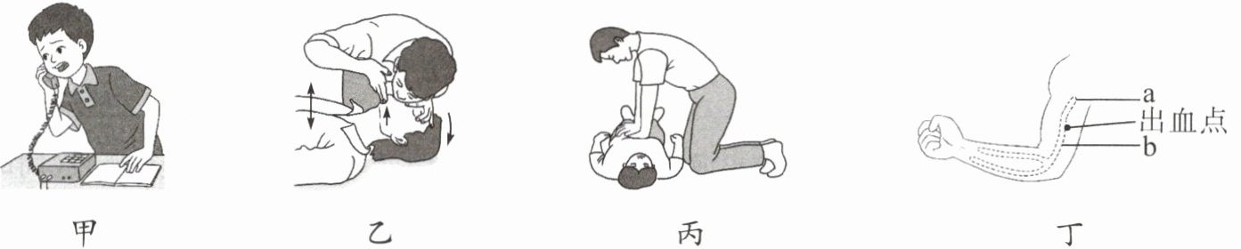 C 【解析】图甲中拨打的电话号码是“120”。图丙胸外按压与图乙人工呼吸的比例是30:2,要先做30次胸外按压,并保持气道通畅,再做2次人工呼吸,如此反复交替进行。进行图丙胸外按压的频率一般为每分钟按压100~120次,使患者尽快恢复自主呼吸。若大动脉出血,应用止血带在图丁中的a点近心端进行止血。