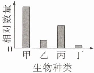 C 【解析】题图表示某生态系统中构成食物链的四种生物在一段时间内的相对数量,在一个完整的食物链中营养级别越高其数量越少,题图中甲的相对数量最多,属于生产者,乙、丙、丁属于消费者,其构成的食物链可表示为甲→丙→乙→丁。该生态系统除了甲、乙、丙、丁四种生物外,还有分解者和非生物部分。