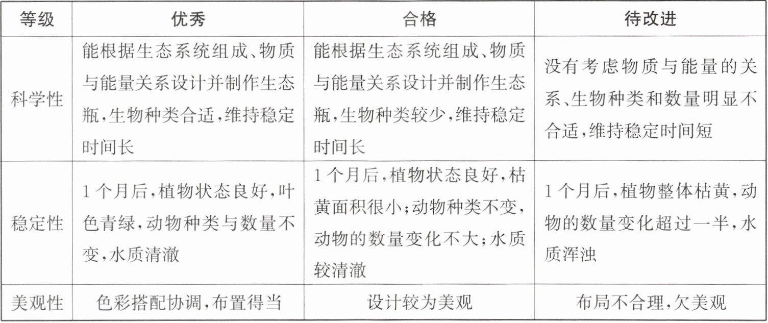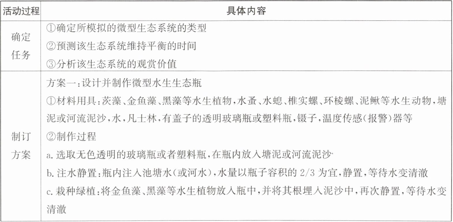 1. 提示 绿色植物所含能量最多。分解者可能在瓶子底层的泥沙中,也可能在加入的水中。2. 提示 要设计多组对照实验。在水质、植物数量、动物数量、见光与否等方面可以设计多组对照实验,最终找出较好的设计方案。3. 提示 不可以。自来水中含残留的消毒剂,大多数水生生物对消毒剂很敏感,在这样的水质中容易死亡。