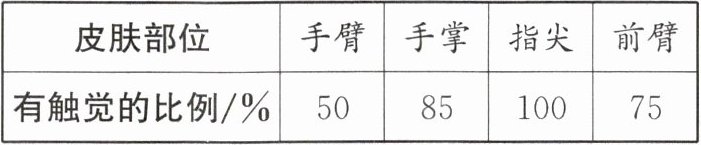 资料二 为测试不同部位的皮肤对触觉的敏感度,小哲利用一支绘图笔在小颖皮肤的某些部位画上测试区。小颖蒙上眼睛后,小哲用针轻轻触碰测试区内不同的点,当小颖感觉到针触时,就说“是”。之后将能感觉到针触的部位的比例记录下来。在不同部位的皮肤上重复实验,其结果如下表所示。