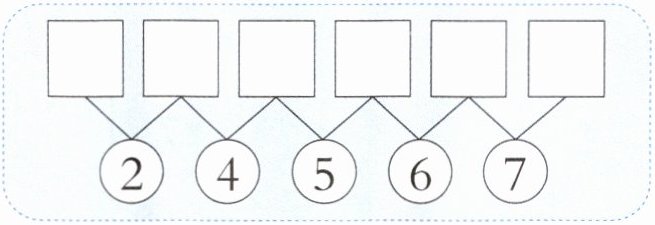 李老师的电脑密码由 6 位数字组成(其中没有 0)。如下图,从左到右相邻两个数分别组成 2、4、5、6、7。请你帮李老师找出密码,写在□里。