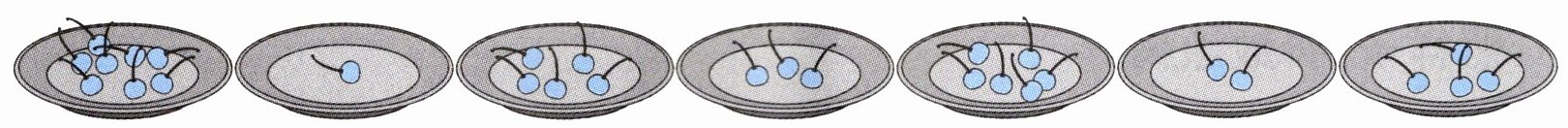 (2)从左边数,第3盘里有( )颗,它与第( )盘合起来有9颗。