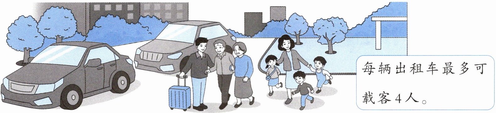 7. 小丽一家要乘坐 2 辆出租车出门,他们可以怎样坐?(用算式表示。)