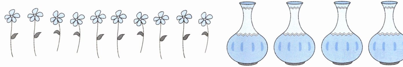 6. 10 枝花插入 4 个花瓶里。怎样分,才能让每个花瓶里都有花且数量都不相同?
