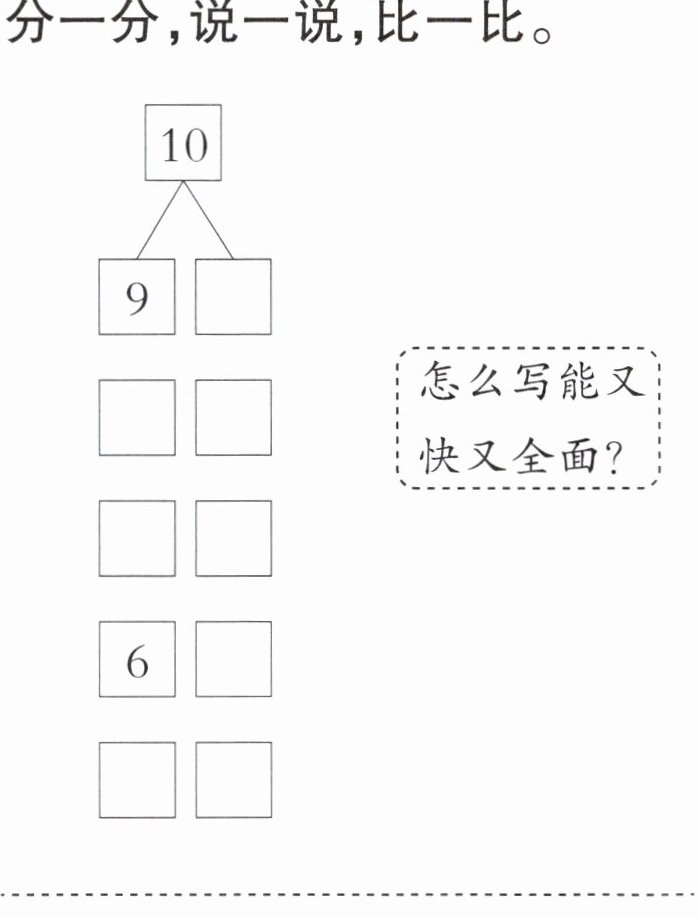 【解析】:10可以分成9和1,故9/1;10还可分成8和2、7和3(答案不唯一);6可以分成5和1,故5/1(答案不唯一)。比较大小:10>9,6<9。
