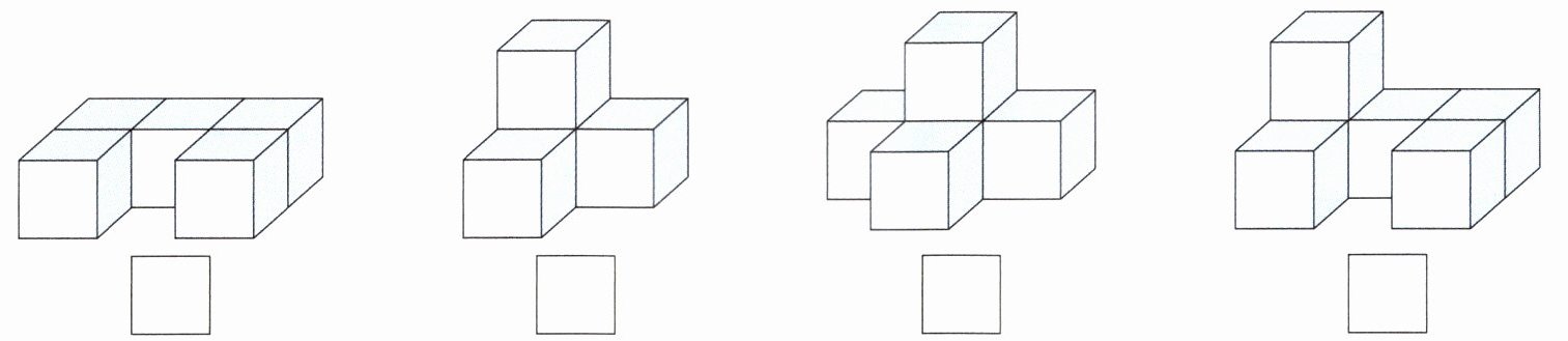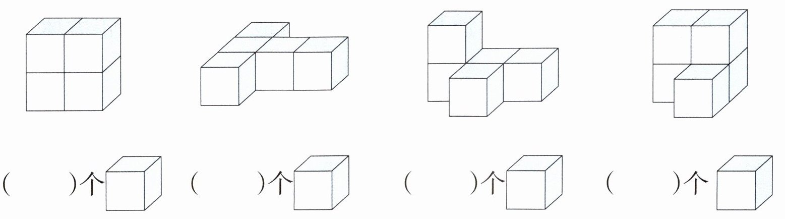 第一组图形:下层4个正方体,上层1个正方体,( )个正方体;第二组图形:下层4个正方体,上层中间1个正方体,( )个正方体;第三组图形:下层3个正方体,上层2个正方体,( )个正方体;第四组图形:下层3个正方体,上层中间1个正方体,( )个正方体。