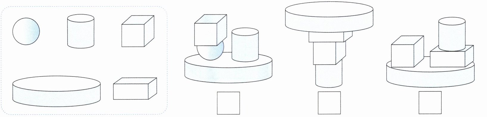 2. 选取4个图形搭一搭。搭得最稳的画“$\surd$”,搭得最高的画“$○$”。