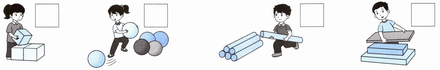 一个女孩在堆正方体,$□$;一个男孩在堆球体,$□内画\surd$;一个男孩在堆圆柱,$□$;一个男孩在堆长方体,$□$。