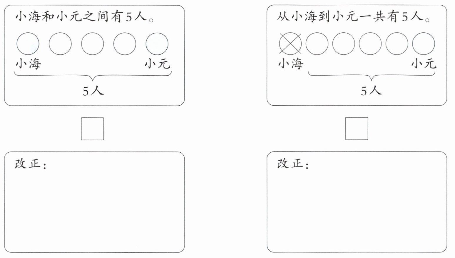 4. 根据描述,判断画图是否正确。正确的在 里画“√”,不正确的在 里画“×”并改正。