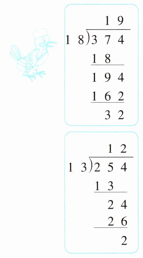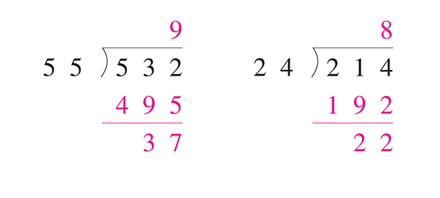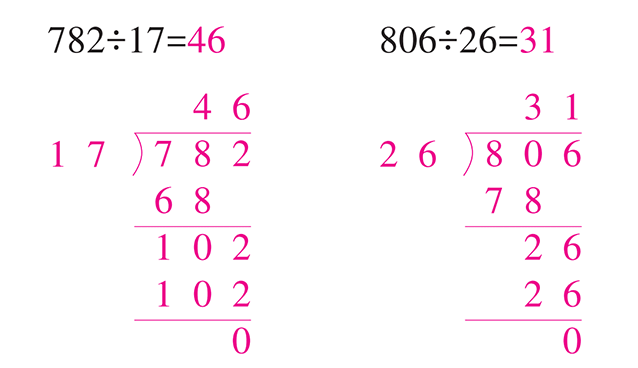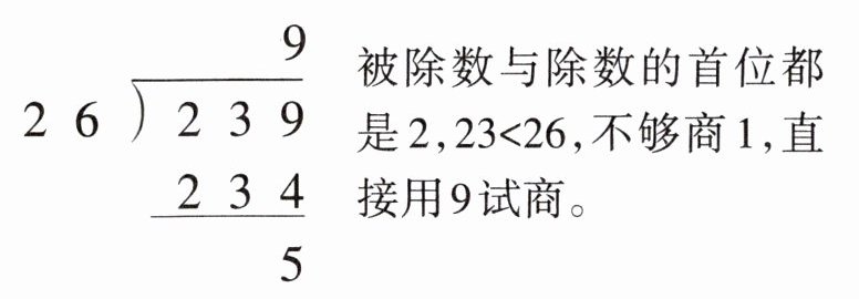 “同头无除商八、九”是指被除数与除数首位上的数字相同(俗称“同头”),但被除数第2位上的数小于除数第2位上的数,不够商1(俗称“无除”),那就可以在下一位上用8或9试商。例如: