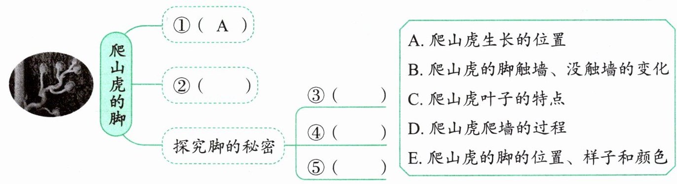 6. 作者通过仔细观察,从哪几个方面介绍了爬山虎?请补充思维导图。(填序号)
