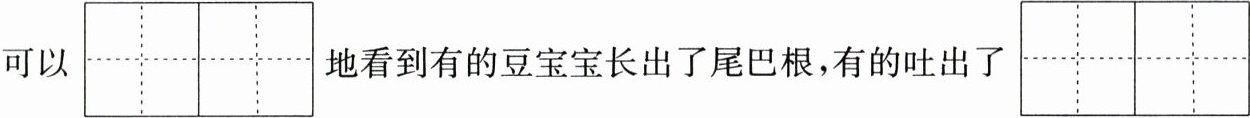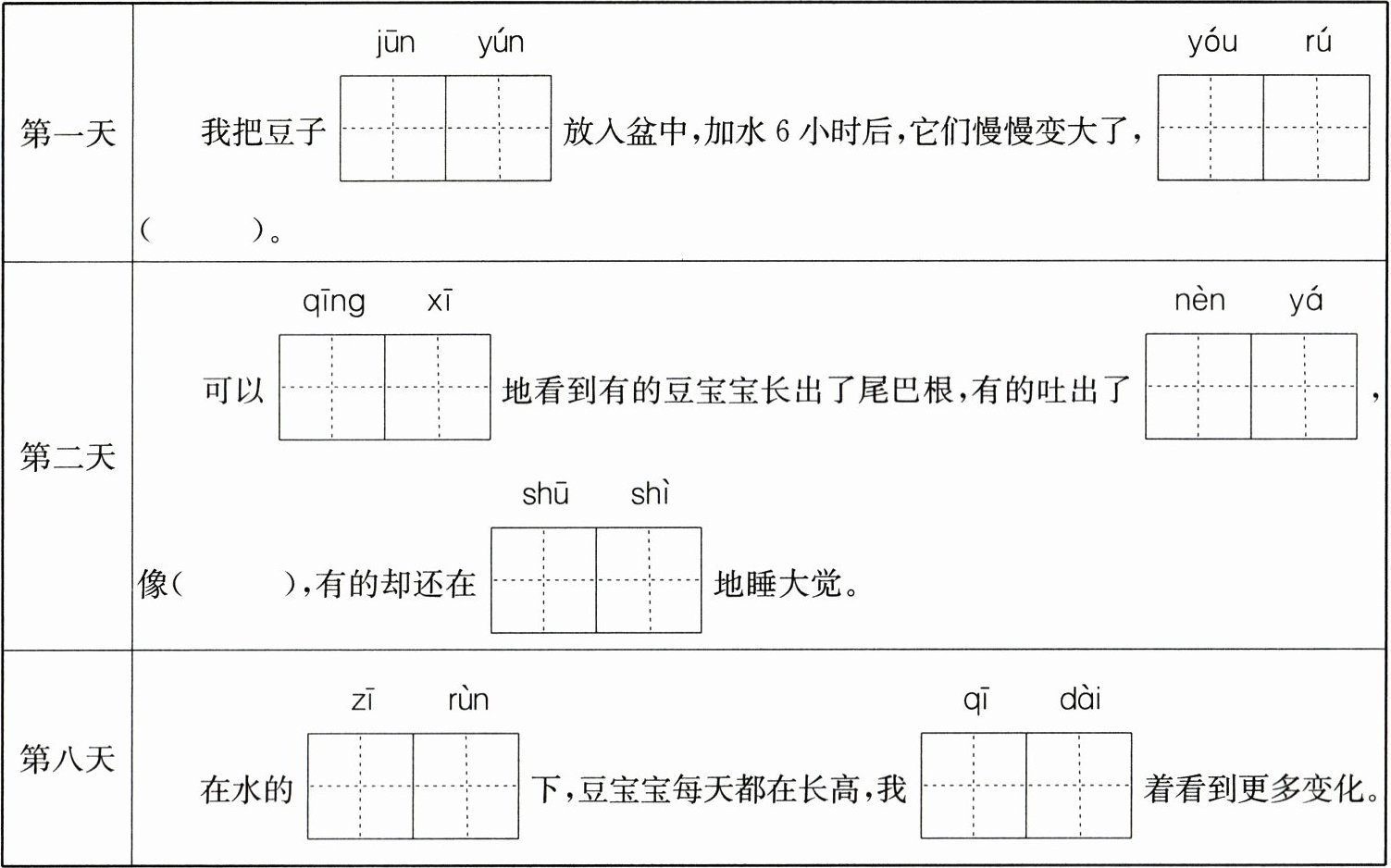 | | 第二天 | 可以 地看到有的豆宝宝长出了尾巴根,有的吐出了 ,像( ),有的却还在 地睡大觉。 |