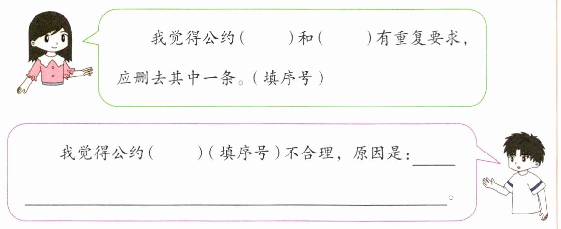 三、实践题 制定班级公约,可以让班级变得更加美好。五年级(1)班全体同学经过讨论,给晨读拟定了以下几条班级公约,其中存在不合理的地方,请讨论并修改。(目标:109)
