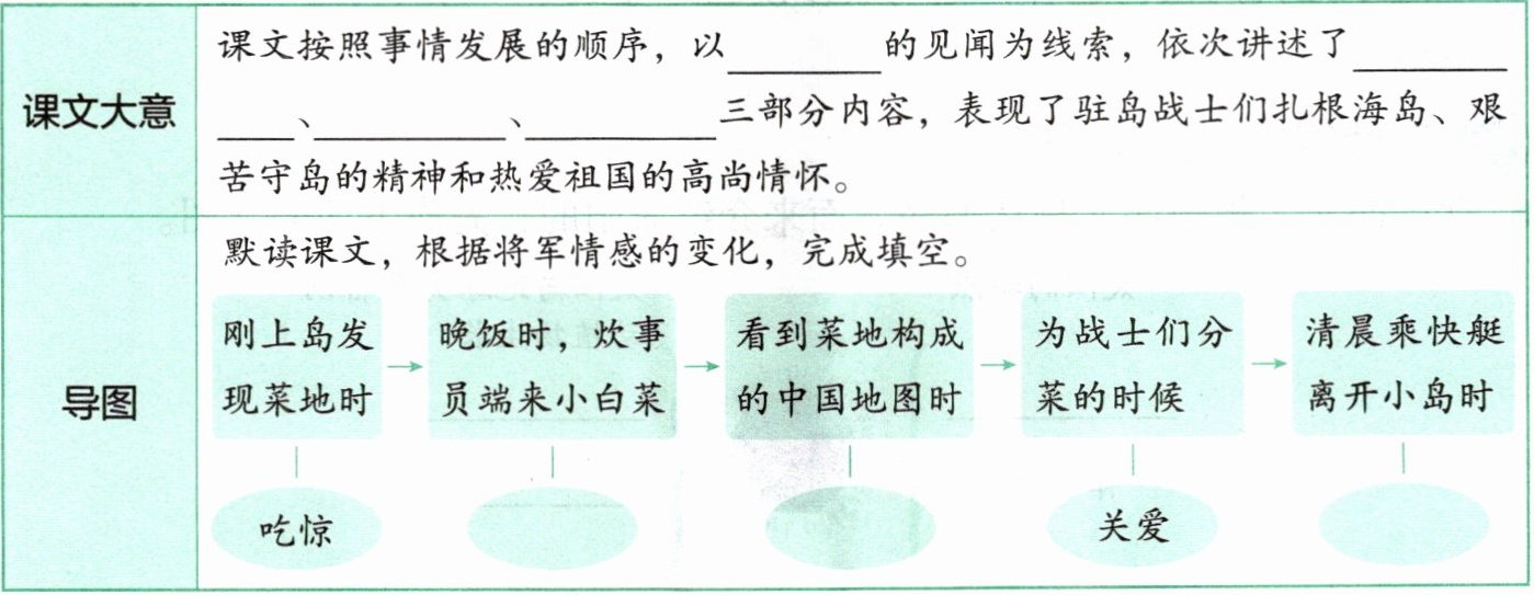 刚上岛发现菜地时→晚饭时,炊事员端来小白菜→看到菜地构成的中国地图时→为战士们分菜的时候→清晨乘快艇离开小岛时