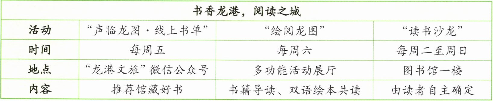 (2)周六前往龙港图书馆二楼,就有机会参加“绘阅龙图”的活动。( )