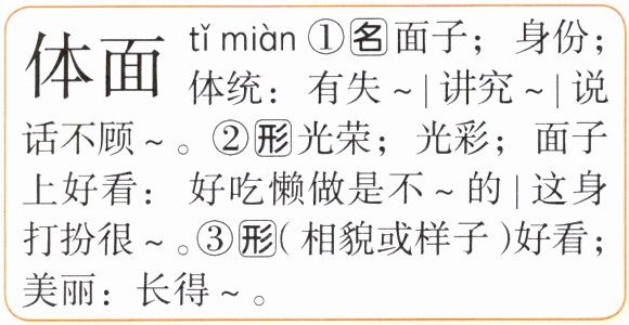 |体面|tǐ miàn ①名面子;身份;体统:有失~|讲究~|说话不顾~。②形光荣;光彩;面子上好看:好吃懒做是不~的|这身打扮很~。③形(相貌或样子)好看;美丽:长得~。|