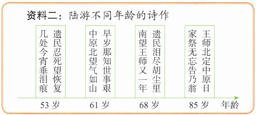 |资料一:诗歌创作于宋宁宗庆元三年(1197)春,此时陆游已73岁,闲居山阴三山别业8个年头,杀敌报国的情思不时涌动心间。|资料二:陆游不同年龄的诗作|