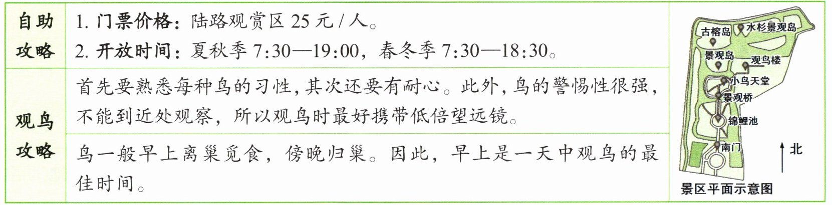 解析:此题考查信息提取。壮壮暑假去“小鸟天堂”,可重点关注自助攻略中的夏秋季开放时间;观察景区平面示意图可知,在北面最佳的观景地点是观鸟楼和景观岛。