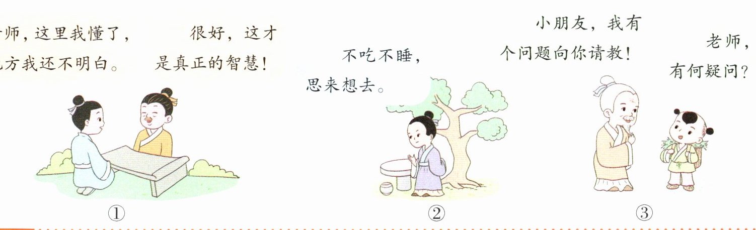 根据漫画内容写出课文中对应的句子:①______;②吾尝终日不食,终夜不寝,______;③______。