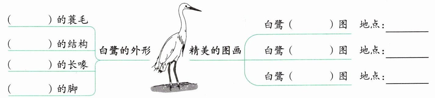 6(左边) 雪白 流线型 铁色 青色 (右边) 垂钓 水田 独立 枝头 低飞 空中