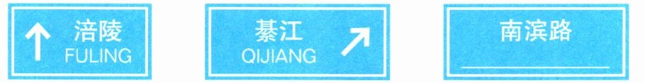 1. 根据路牌示意图,我猜测“涪陵”两个字的读音是____,“綦”的读音是____。我还会给第三个路牌示意图中的地名标上拼音:____。(可以查字典)