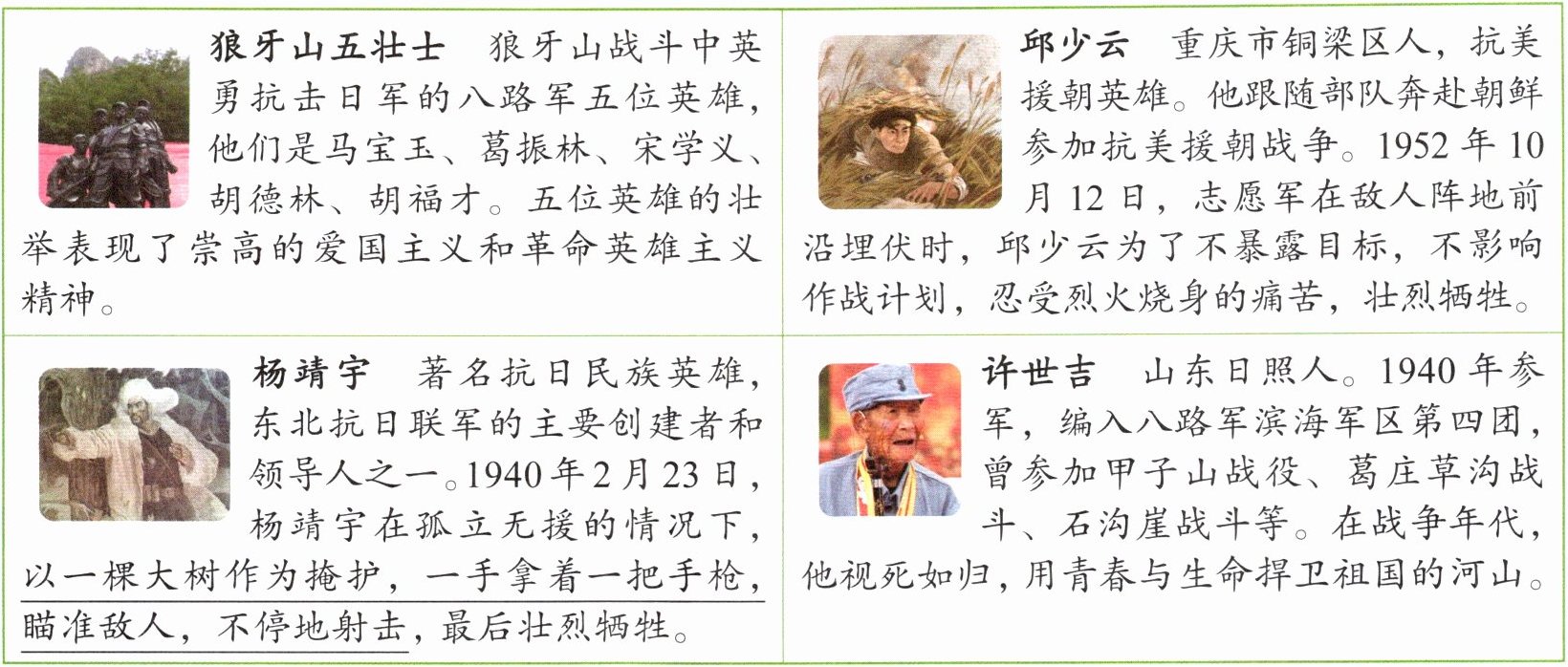 ||狼牙山五壮士 狼牙山战斗中英勇抗击日军的八路军五位英雄,他们是马宝玉、葛振林、宋学义、胡德林、胡福才。五位英雄的壮举表现了崇高的爱国主义和革命英雄主义精神。||邱少云 重庆市铜梁区人,抗美援朝英雄。他跟随部队奔赴朝鲜参加抗美援朝战争。1952年10月12日,志愿军在敌人阵地前沿埋伏时,邱少云为了不暴露目标,不影响作战计划,忍受烈火烧身的痛苦,壮烈牺牲。|