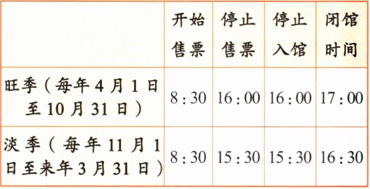 | | 开始售票 | 停止售票 | 停止入馆 | 闭馆时间 |