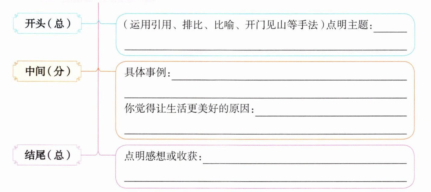 - 开头(总):(运用引用、排比、比喻、开门见山等手法)点明主题:____