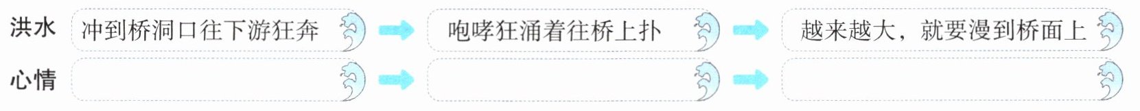 由于前几天连续下暴雨,山洪暴发,河水开始猛涨。这天早晨,天刚亮,老葛和妻子一来到桥头就惊呆了。只见那汹涌的洪水怒吼着从山上冲下来,挟带着大量的泥沙、石块、树枝,冲到桥洞口,顺着桥洞往下游狂奔。老葛站在桥头,感到石桥仿佛在颤抖,在呻吟。老葛的心也紧跟着抖动了一下。