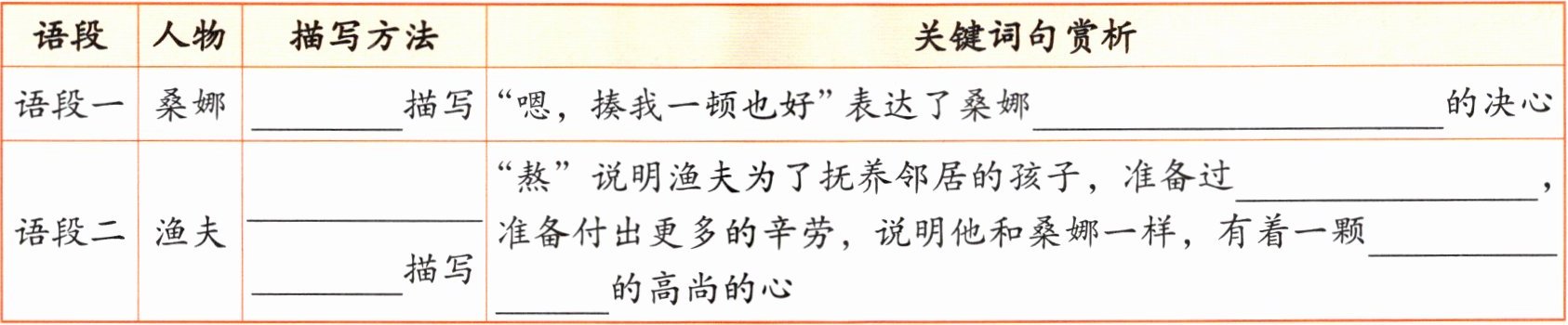 解析:本题考查品析重点语句和感受人物形象的能力。从语段一对桑娜神态、心理的描写中,我们能读出桑娜的忐忑不安、犹豫不决。“嗯,揍我一顿也好”表达了桑娜宁可自己受苦也要收留孤儿的决心。语段二需要关注对渔夫神态、语言、动作的描写,抓住关键词“熬”,体会渔夫宁可自己受苦也要帮助他人的美好品质。