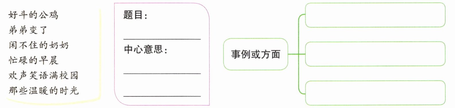 (示例)题目:闲不住的奶奶 中心意思:奶奶是一个闲不住的人 事例或方面:每天为家人准备三餐,且不重样 天天打扫卫生,家里总是很整洁 一有空就参加社区组织的志愿服务 每天为家人准备三餐,且不重样