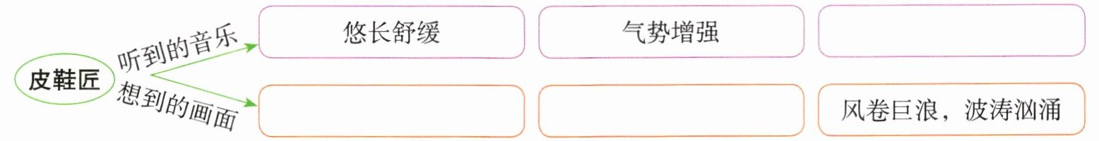 皮鞋匠$\begin{cases} 听到的音乐 \begin{cases} 悠长舒缓 \\ 气势增强 \\ \end{cases}\\ \\ 想到的画面 \begin{cases} \\ \\ 风卷巨浪,波涛汹涌 \end{cases} \end{cases}$