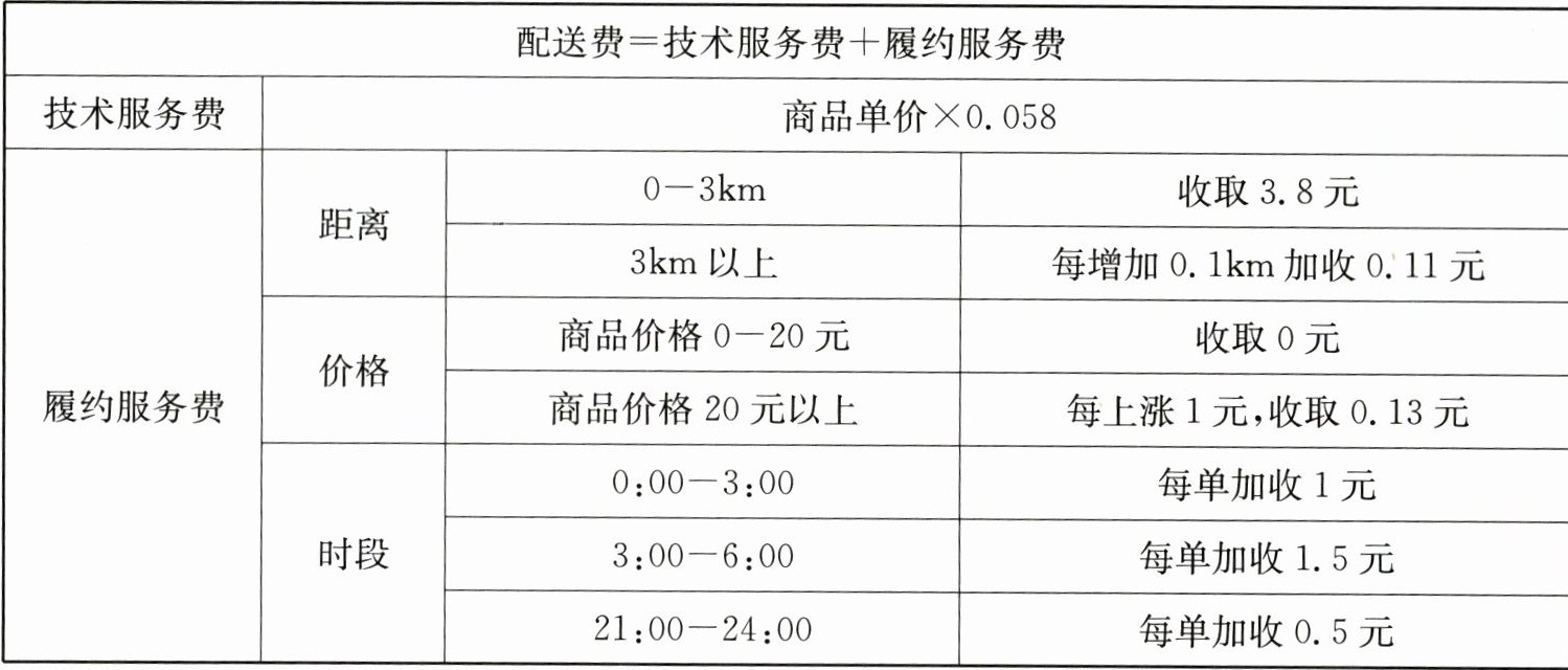 6. 近年来,外卖在现代人生活里占据重要地位。数据显示,我国在线餐饮外卖用户数量突破 $5.35$ 亿人次。以下为某城市一外卖平台配送费计费方式。