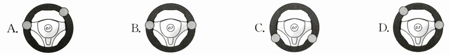 2. 驾车时双手握方向盘的方法是:左手握在方向盘的十点钟方向,右手握在三点钟方向,这样可以应对各种紧急情况。下面按要求握方向盘的是(