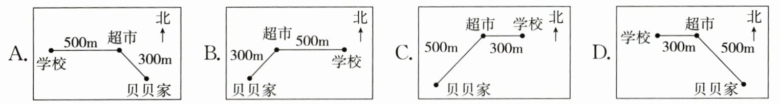 3. 贝贝说:“我每天从家出发向东北方向走300m到超市,再向正东方向走500m到学校。”根据贝贝的描述,下面路线图正确的是(