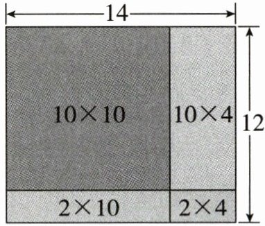 2. 壮壮在计算$14×12$时,利用图形想到了不一样的计算方法,如图。请你借助长方形,用分一分、画一画、算一算等方式将计算$3.8×1.4$的思考过程表达出来。(3分)