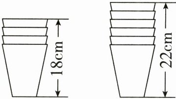 6. 如图,4 个杯子叠起来高是 18cm,6 个杯子叠起来高是 22cm。照这样计算,$ n $ 个杯子叠起来的高度可以用下面( )中的关系式来表示。