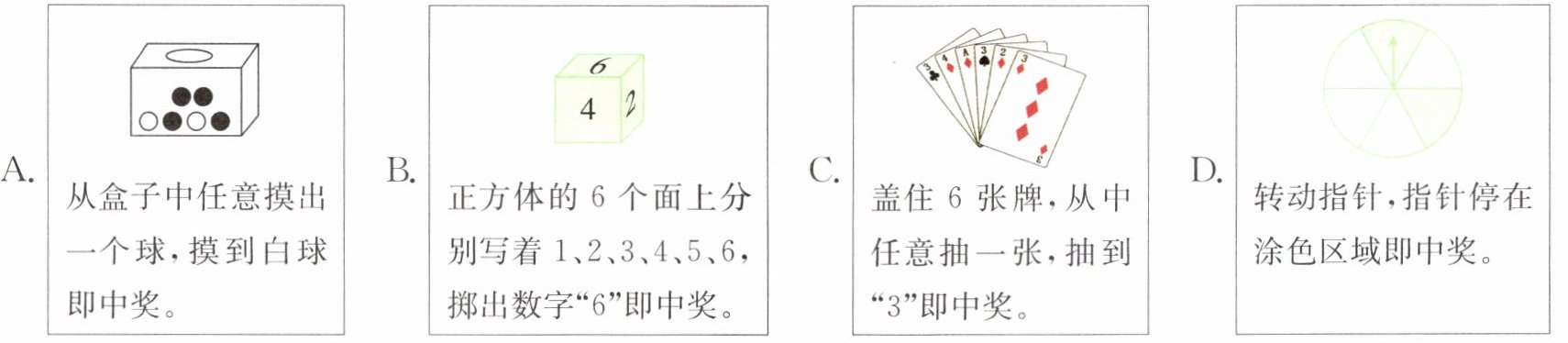 解析:选项A,摸一个,6个球都有可能被摸到,能中奖的白球只有2个;选项B,掷一次,有6种可能出现的结果,中奖的只有数字“6”;选项C,抽一张,有6种可能出现的结果,中奖的“3”有3张;选项D,转一次,这6个区域都有可能转到,能中奖的涂色区域有2份。所以选项C中奖的可能性最大。