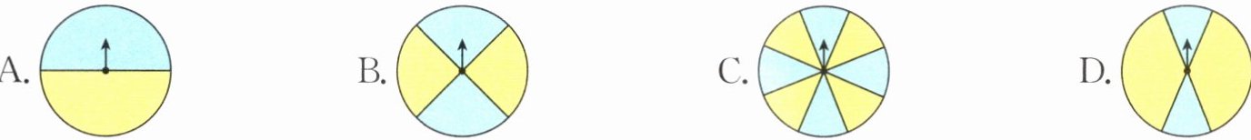 (2)福建真题 淘淘和壮壮玩跳棋,用转转盘的方式来决定谁先走,如果转动后指针指向黄色淘淘先走,指向蓝色壮壮先走,指向分界线重新转。下面转盘不公平的是(