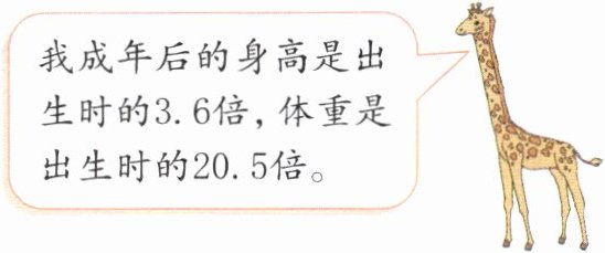 4. 长颈鹿是世界上现存最高的陆生动物。一只长颈鹿出生时身高 1.5m,体重 51.4kg。这只长颈鹿成年后高多少米?重多少千克?