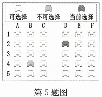 5. 张叔叔要坐飞机去北京,他选择了网上值机选座。如图,他一开始想选“B4”位置的座位,发现不可选择,于是改成了当前选择的座位,这个位置可以用“( )”表示。