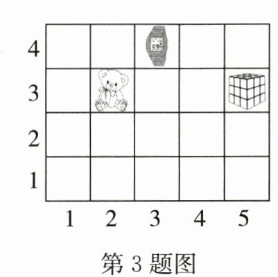 3. 如图,如果电话手表的位置用数对表示是$(3,4)$,那么魔方的位置用数对表示是( , ),玩具熊的位置用数对表示是( , )。