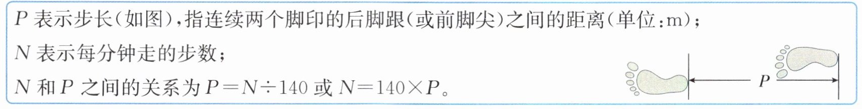 $ P $ 表示步长(如图),指连续两个脚印的后脚跟(或前脚尖)之间的距离(单位:$ \mathrm{m} $);