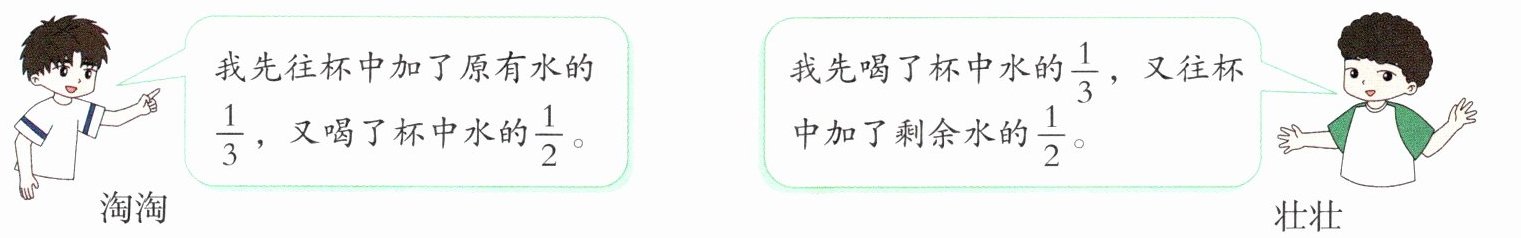 解析:解决此类问题,要先找准单位“1”,再确定是比单位“1”多(或少)几分之几。淘淘加的是原有水的$\frac{1}{3},$喝的是原有水的$(1+\frac{1}{3})$的$\frac{1}{2},$所以淘淘的杯中剩余的水是$150×(1+\frac{1}{3})×(1-\frac{1}{2})=100(mL)。$壮壮喝的是原有水的$\frac{1}{3},$加的是原有水的$(1-\frac{1}{3})$的$\frac{1}{2},$所以壮壮的杯中剩余的水是$150×(1-\frac{1}{3})×(1+\frac{1}{2})=150(mL)。$