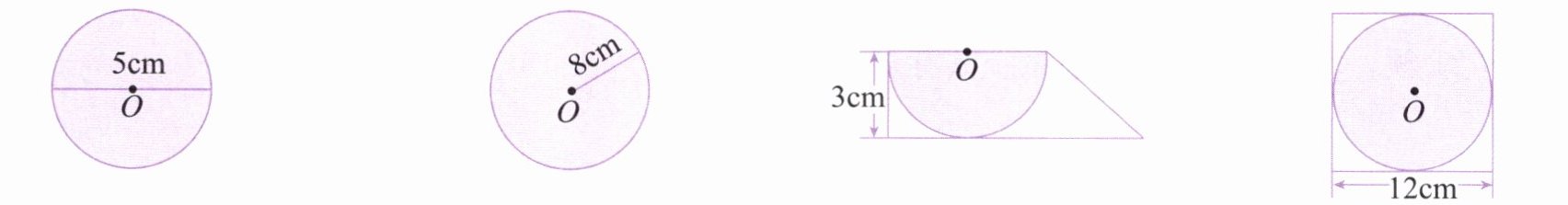 (从左到右四个圆,第一个圆半径$r = 5cm$,圆心为$O$;第二个圆直径$d = 8cm$,圆心为$O$;第三个半圆直径$d =$ ,圆心为$O$,高$3cm$;第四个圆直径$12cm$,半径$r =$ ,圆心为$O$)