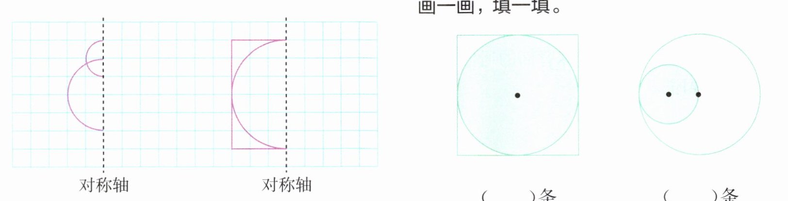 解析:对折后能够完全重合的图形就是轴对称图形,折痕所在的直线就是它的对称轴,据此画出图形的对称轴。左图是正方形里有一个最大的圆,正方形有4条对称轴,所以此组合图形也有4条对称轴;右图只有1条对称轴。
