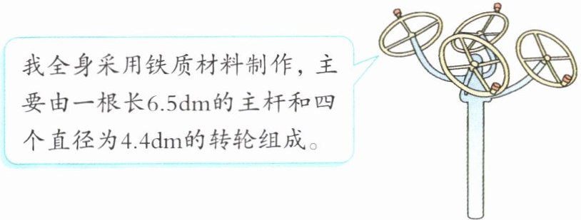 我全身采用铁质材料制作,主要由一根长 6.5dm 的主杆和四个直径为 4.4dm 的转轮组成。