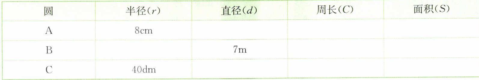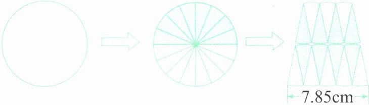 解析:根据图可知,梯形的下底$=\frac{5}{16}C_{圆}$,由此可以求出圆的周长为25.12cm,利用$r=\frac{C_{圆}}{2\pi}$求出$r=4cm$,再用$S=\pi r^{2}$求出圆的面积。还有另一种思路:因为圆的面积=梯形的面积,所以求出梯形的面积就求出了圆的面积。要求梯形的面积必须知道上底、下底和高,梯形的上底+下底$=\frac{1}{2}C_{圆}$,梯形的高$=2r=d$,先求出圆的周长,再求出圆的直径,最后用梯形的面积公式计算。