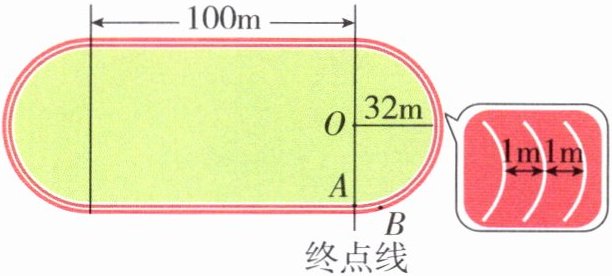 3. 北京真题 如图,一个运动场两端是半圆形,中间是长方形。淘淘和壮壮进行跑步比赛,他们分别从 A、B 两点出发,沿跑道线跑一圈,最后都回到终点。为了使比赛公平,淘淘和壮壮的起跑线应相差多少米?(π取 3.14)